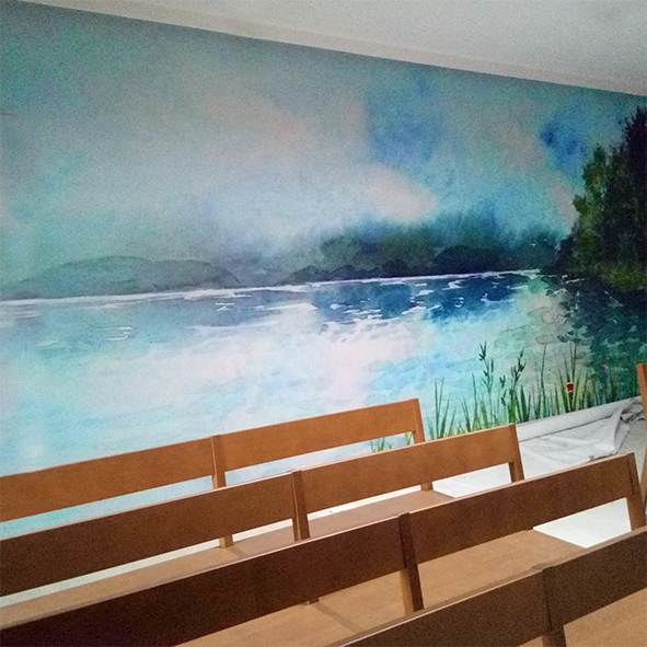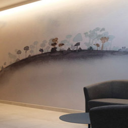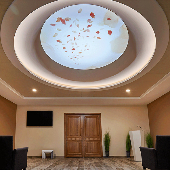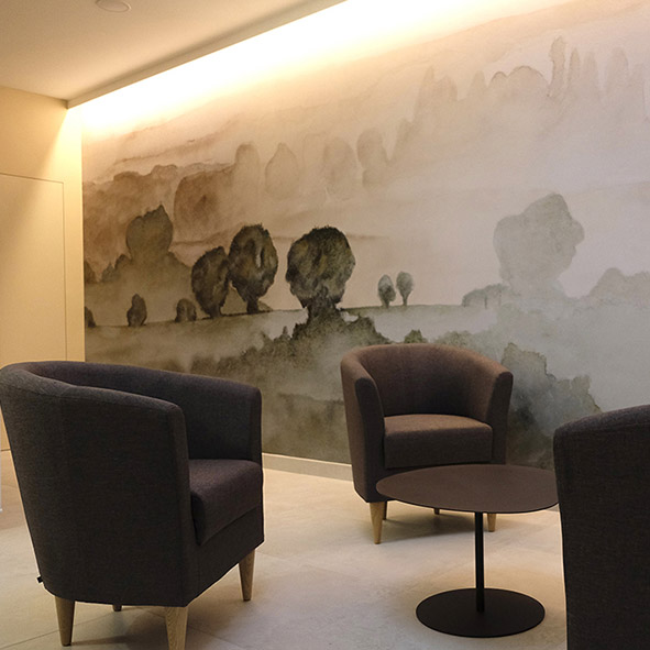 Pour ce funérarium, nous avons travaillé une présence artistique discrète, presque silencieuse, pour accompagner les familles sans jamais occuper l’espace. Chaque choix est guidé par une même intention : respecter, apaiser, soutenir.